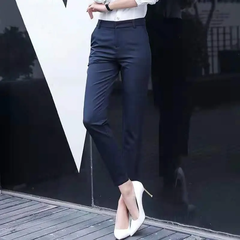 Portez le pantalon cigarette taille haute bleu marine au bureau avec une veste bien coupée pour une allure professionnelle irréprochable. Son design minimaliste et sa couleur sobre en font une pièce maîtresse qui s’adapte facilement à divers environnements de travail, garantissant une allure élégante et soignée.